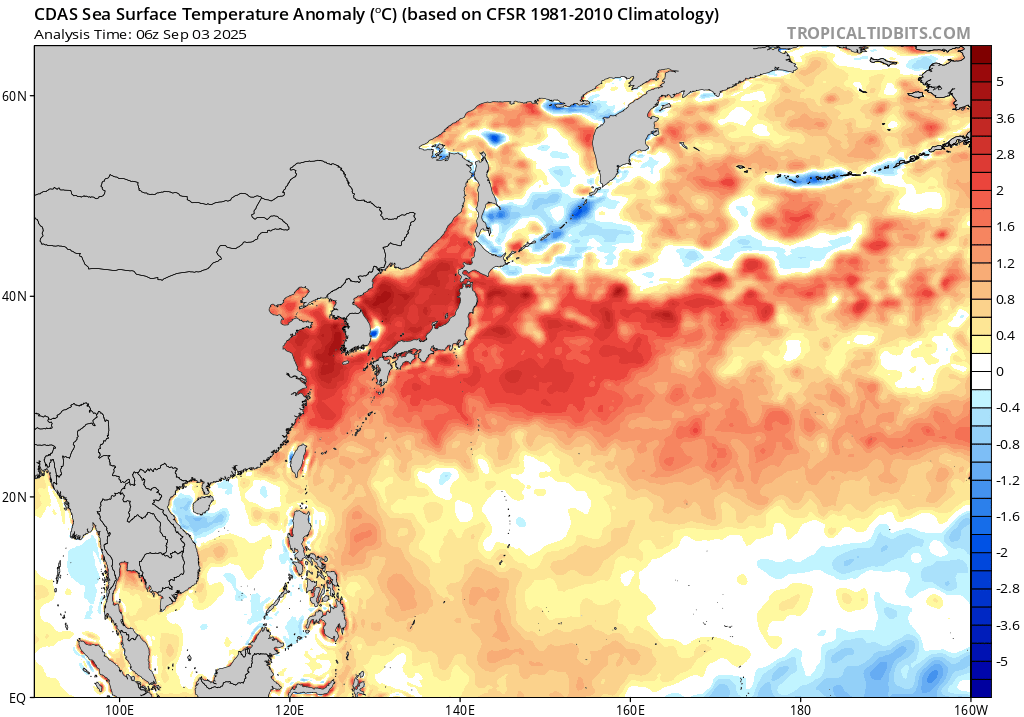 Asia had yet another hot summer, with population centers from eastern China to Korea to Japan all recording very impressive temperatures. This was driven by both the neutral to weak La Nina ENSO conditions as well as the anomalously warm SSTs adjacent to eastern Asia. We can see the impressive SST anomalies below, with most areas 2-3°C above the 1981-2010 normals.