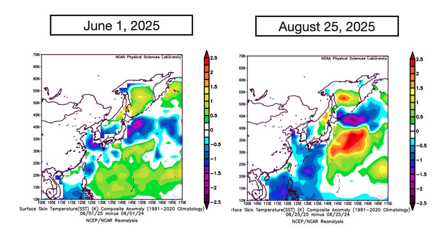 Comparing SSTs from 2025 to 2024, we can see early in the season (left) much of the water southeast of Japan was warmer than 2024 (warmer colors) while the Yellow Sea was cooler than 2024 (cooler colors). This largely continued through the season, with waters near Tokyo significantly warmer in 2025 versus 2024.