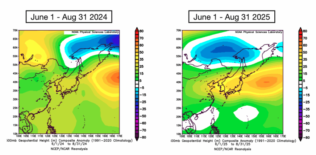 Looking at the upper level pattern, we can see the ridge (warmer colors) was actually stronger in 2025 over Japan and Korea compared to 2024. Both years had a bunch of ridging which supported all the warmth we witnessed.