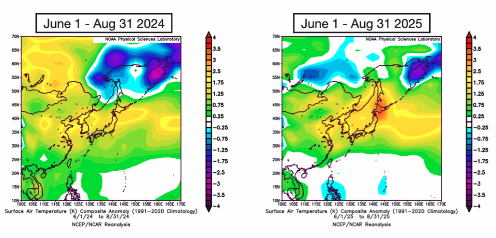 Looking at actually temperature anomaly, we can see northern Japan especially was warmer in 2025 versus 2024. The 2 seasons are side by side below.