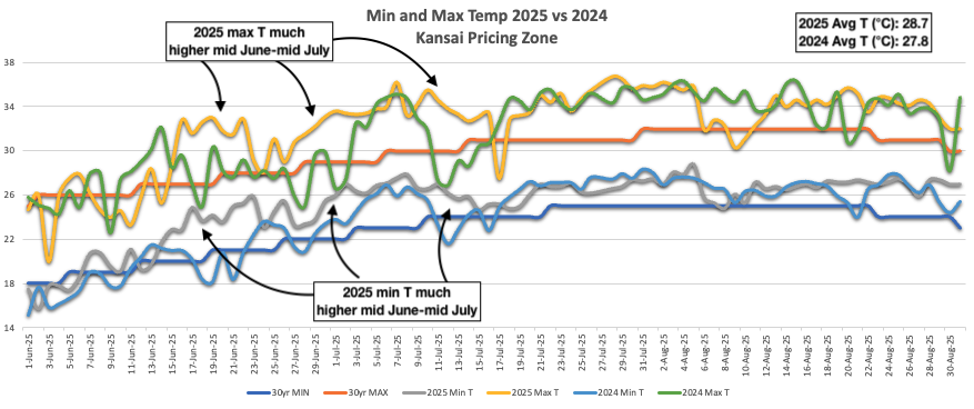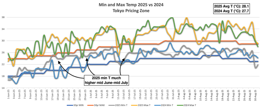 Digging deeper, we plotted population weighted minimum and maximum temperatures for Tokyo and Kansai regions for the past 2 June 1-August 31 periods (2024 and 2025). Notice the overnight lows especially (but even daytime highs) were hotter in 2025 especially from mid-June through mid-July. Daytime highs were a bit higher during that same period especially in Kansai. That was the difference in terms of what drove 2025 to be a bit hotter regionally, and we can mostly blame those very warm SSTs.