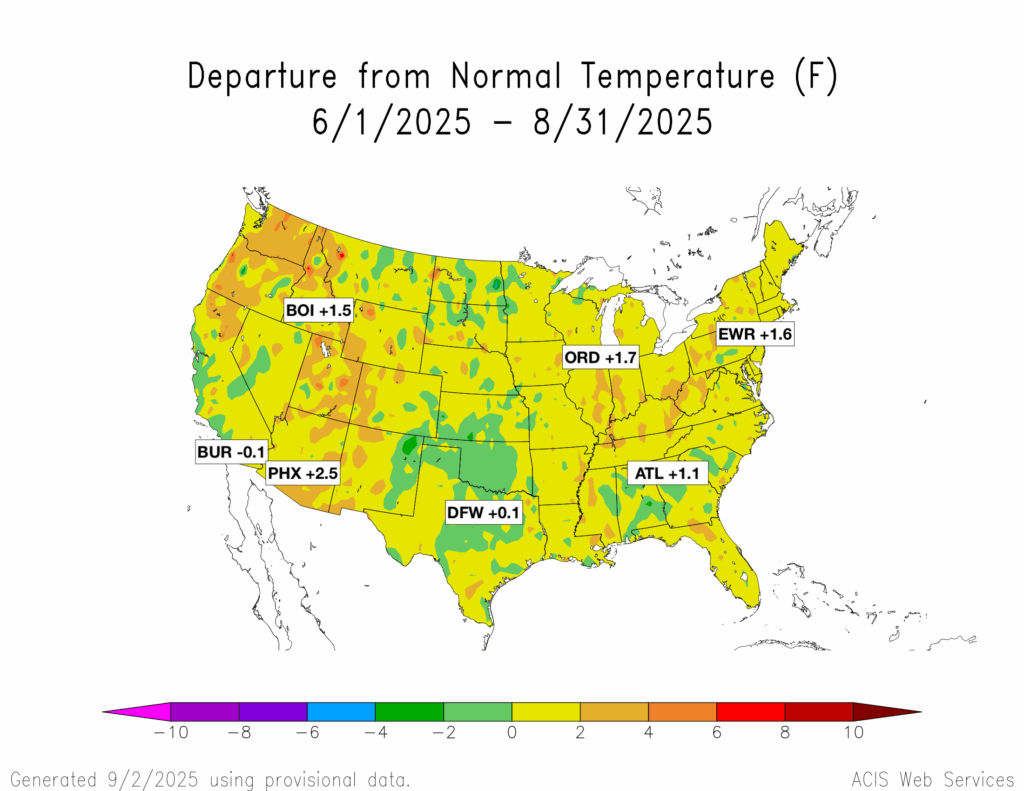 To start, let’s look at the temperature verification map for the CONUS from June 1 – August 31, 2025. Heat was spread out this year, with the Interior West and Northeast seeing extended periods, at times. All cities listed are cooler in 2025 compared to 2024’s June-August with the exception of Chicago (+1.7°F this year, +1.3°F last year).
