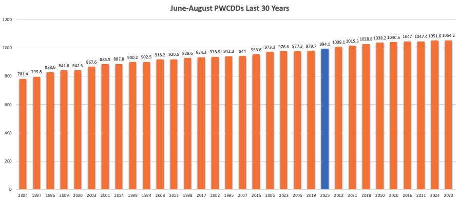 We ended the season with 994.1 CDDs, the coolest since 2023 (976.6) and second coolest since 2019 (979.7).