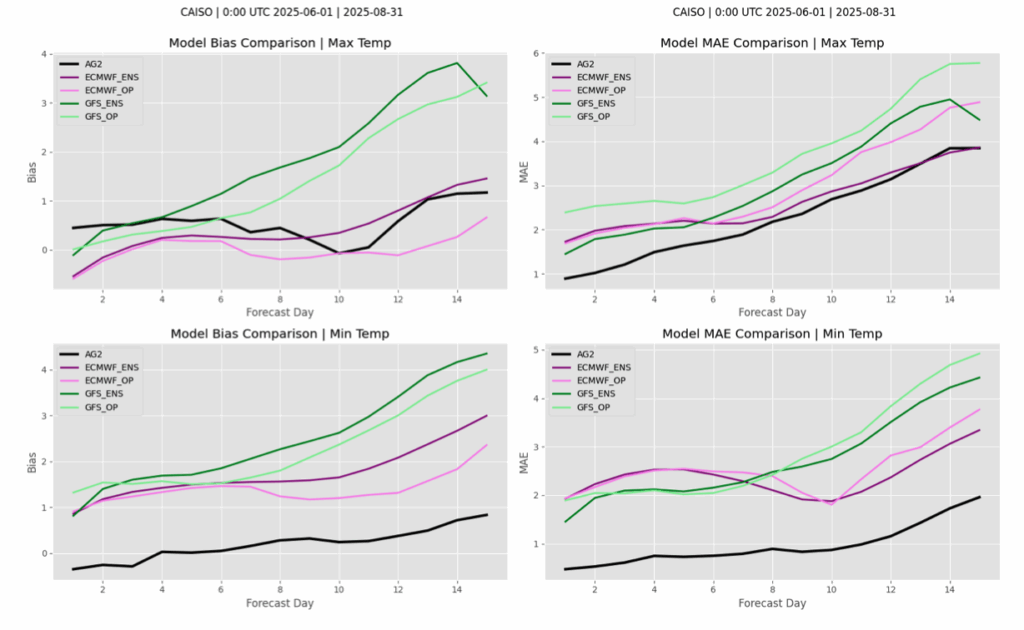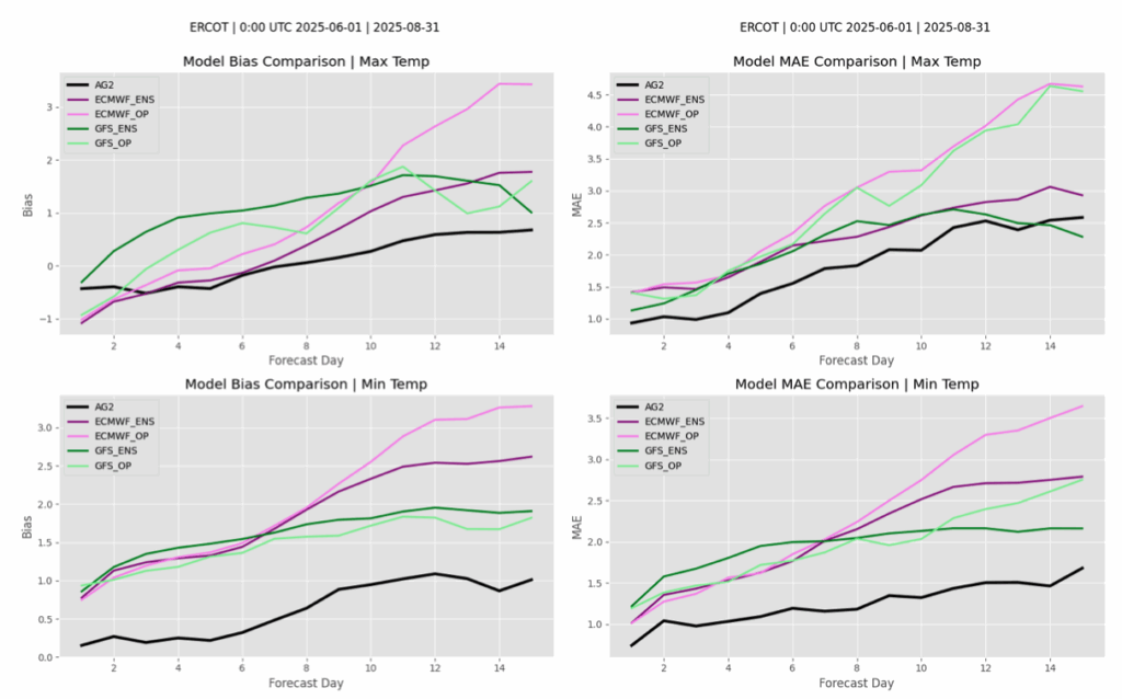 In ERCOT, AG2 was superior for much of the period for max temps, with the GFS ENS better day 15-16. The AG2 forecast was best for min temps throughout. Models were much too warm for min temps.