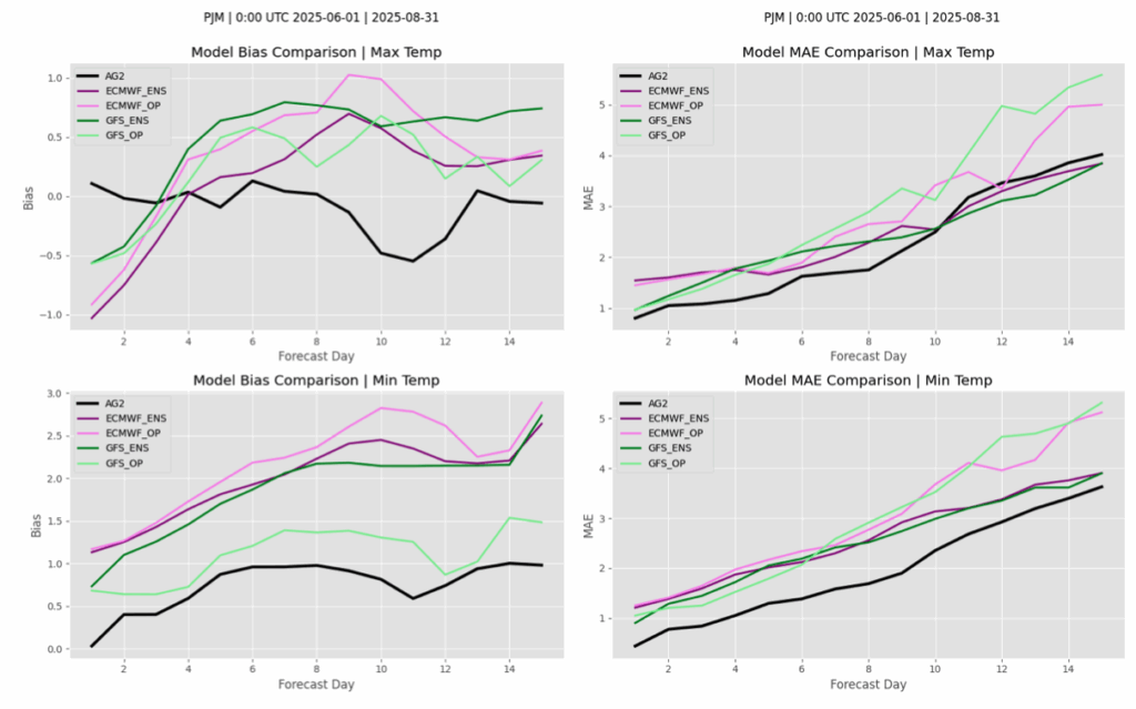 In PJM, AG2 MAE is generally the lowest/best throughout the 15 day period for both min and max temp, but did get challenged in the 11-15 day by the bias corrected GFS/ECMWF ENS for max temps.