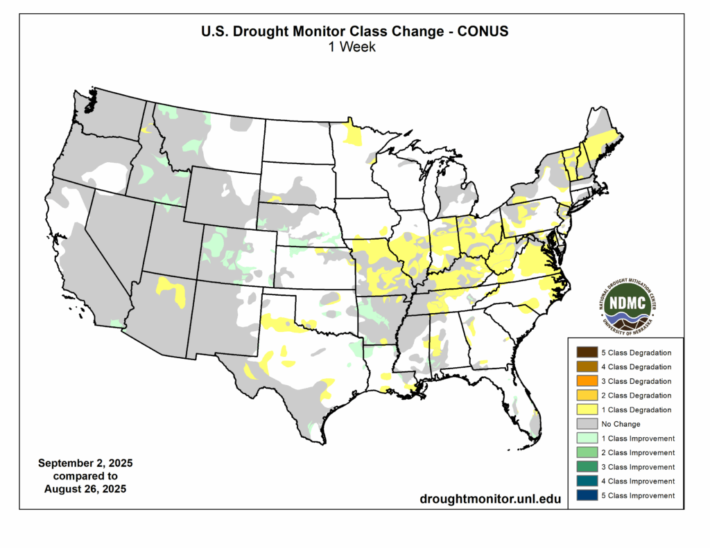 Comparing conditions to just one week earlier, from August 26 to September 2, several regions saw notable shifts. Parts of the Mid-Atlantic, Southeast, and Texas experienced one- to two-class degradations, signaling rapidly worsening drought stress. However, improvements occurred in the Northern Plains, Rockies, and sections of the Pacific Northwest, where recent rainfall has provided some relief. Overall, much of the country remained stable with little change, but the areas of worsening drought highlight how quickly conditions can deteriorate in the late summer season.