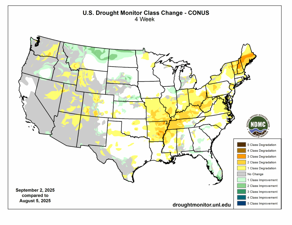 Looking back over the past four weeks, the broader trend underscores both the persistence and expansion of drought in many regions. While some improvement is evident in the central U.S. and the Northern Rockies, widespread degradation has occurred across the Northeast and Mid-Atlantic, where drought has intensified over the past month. The western U.S. continues to carry the deepest and most persistent drought, with long-term impacts to water availability, agriculture, and ecosystems. As we head further into September, close monitoring will be critical, as short-term weather shifts can either intensify drought conditions or provide much-needed relief.