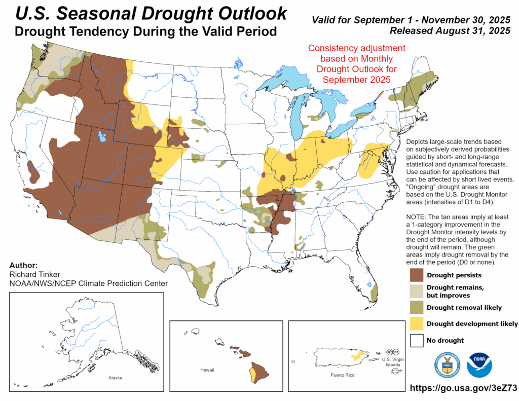 The seasonal drought outlook for September through November 2025 offers both challenges and cautious optimism. Across much of the Southwest and interior West, drought is expected to persist through the fall, with only limited improvement likely. In contrast, parts of the central U.S., including portions of the Southern Plains and Mississippi Valley, show potential for at least some improvement in drought intensity, though not full recovery. Encouragingly, sections of the Midwest and parts of the Southeast are expected to see drought removal by the end of the season if forecast rainfall materializes. However, new areas of concern are emerging, with drought development likely across portions of the Ohio Valley and mid-Atlantic, suggesting that late summer dryness could evolve into longer-term issues. Overall, while the seasonal outlook points to gradual improvement in some regions, the entrenched drought in the West remains the most persistent and concerning feature of the national drought landscape.