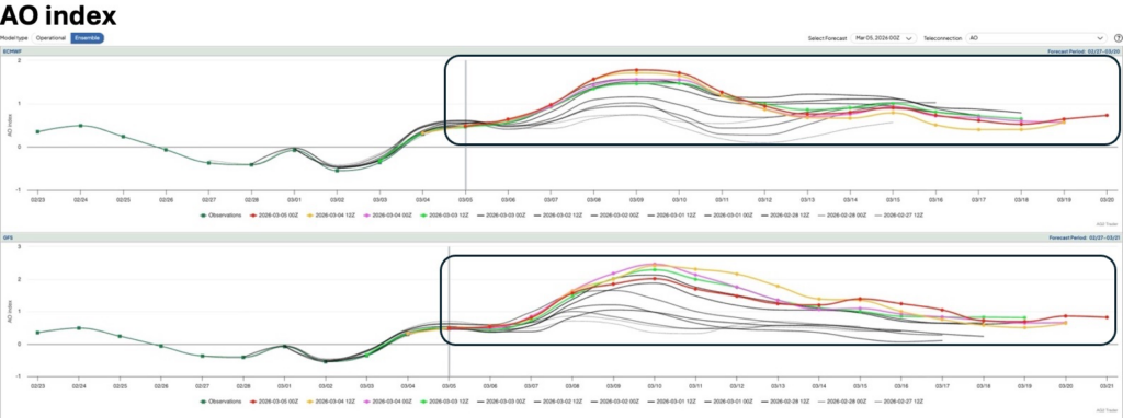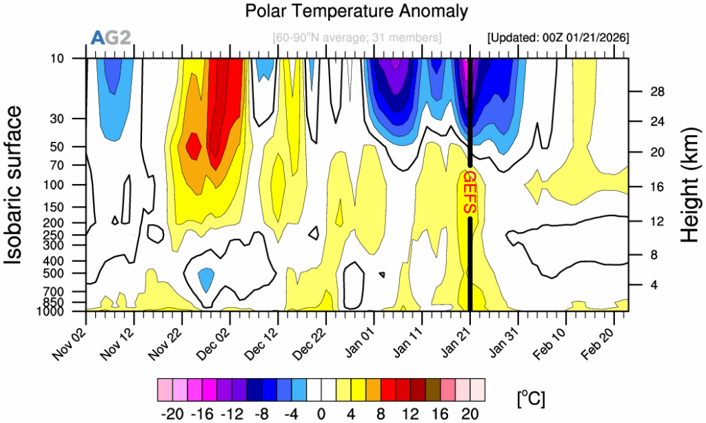 The AO forecast is the main detractor of a stronger stratosphere-troposphere coupling event. Tighter coupling would in fact skew the AO towards negative values, while the latest projections resolve an overall +AO through the next couple of weeks, limiting the Arctic’s propensity to open its cold-air taps for now.