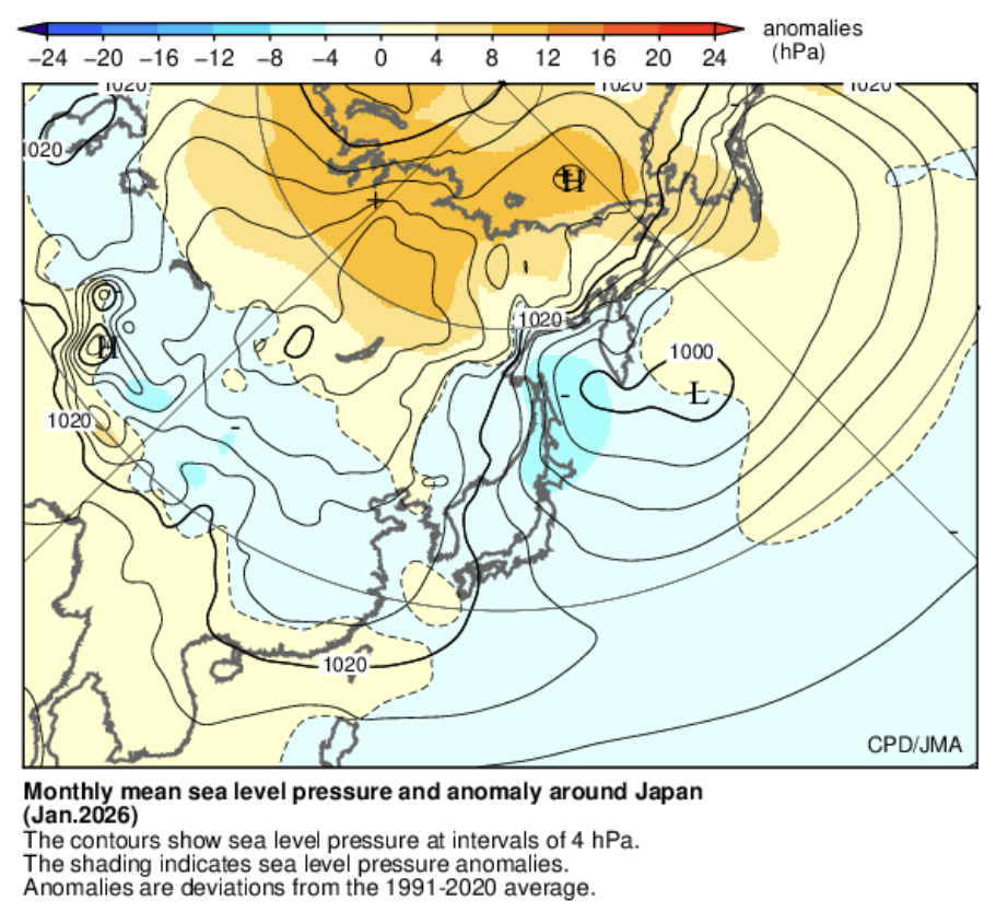 At times, the Siberian High extended toward western Japan and even Okinawa, reducing the influence of low-pressure systems across much of Pacific-side Japan.