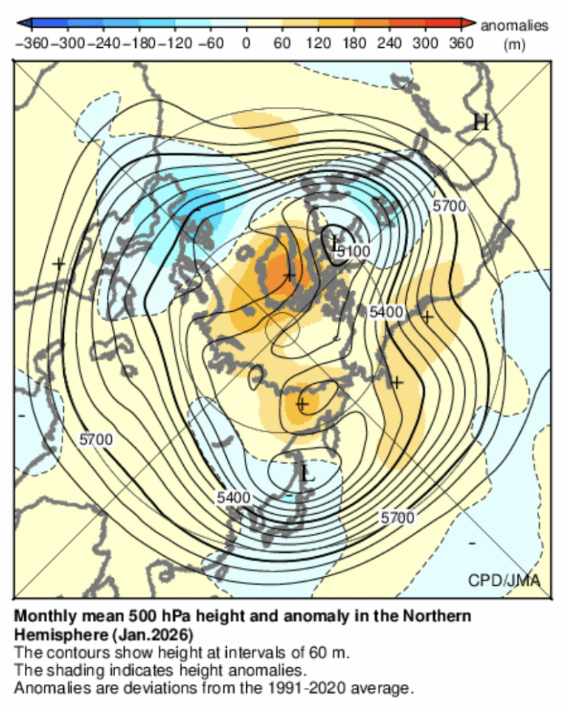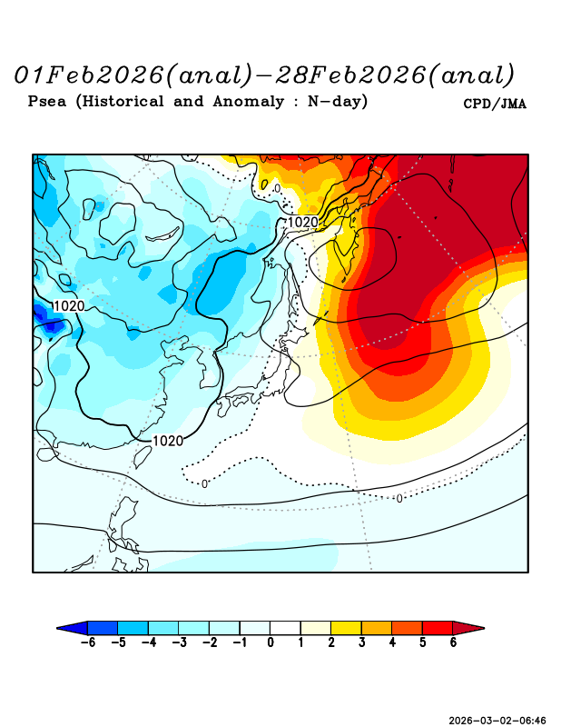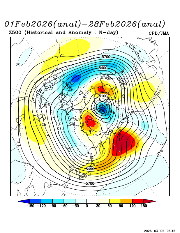 The polar-front jet occasionally dipped south near northern Japan, allowing some cold intrusions. However, 500mb height anomalies were often positive near Japan, limiting sustained upper-level cold influence. At the surface, both the Aleutian Low and the Siberian High were relatively weak.