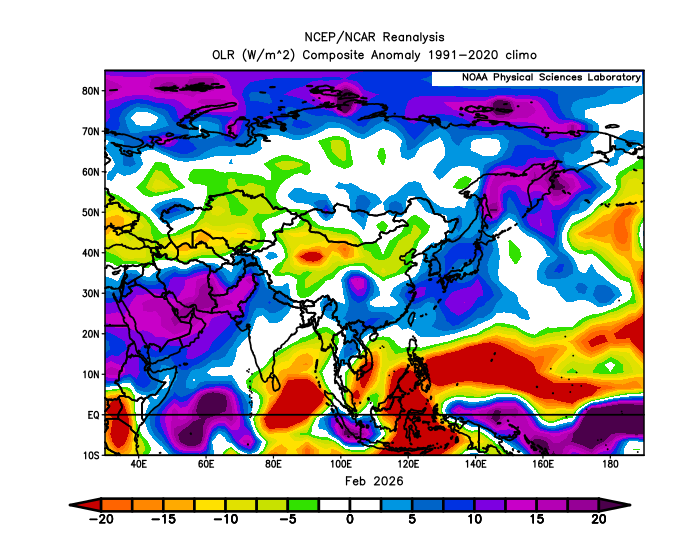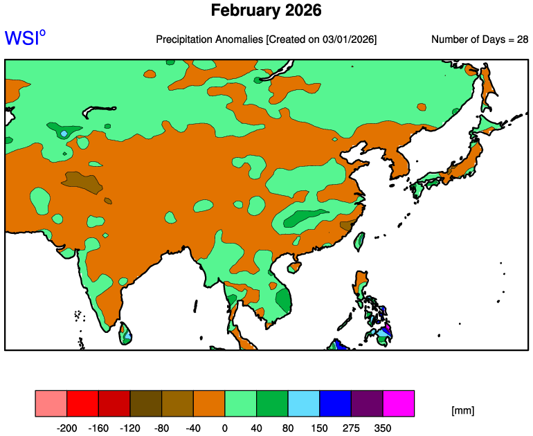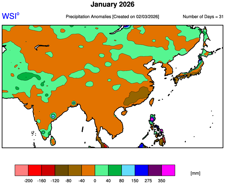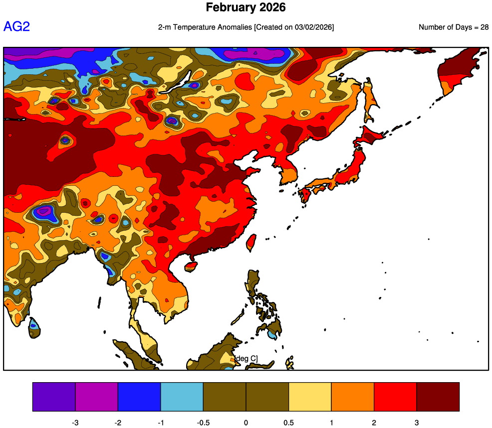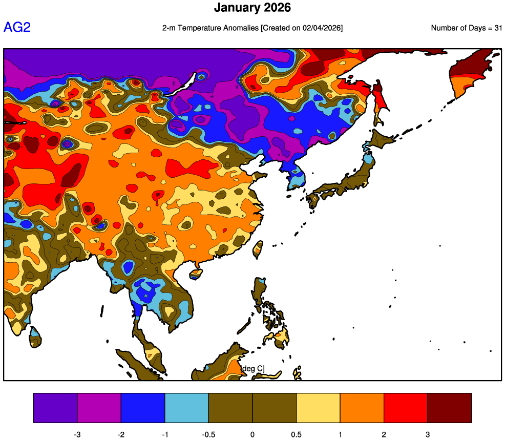 East Asia saw a broadly warm month, driven by a relatively mild upper-level pattern despite occasional cold intrusions. Over Japan, low- and high-pressure systems moved through in a fast cycle, and winter monsoon conditions did not persist for long. Early in the month, a brief but strong winter pattern pushed cold air south, producing heavy snowfall across the Sea of Japan side and, locally, the Pacific side. Mid-to-late month was generally dry as storm tracks were limited, before more organized rain arrived later, especially across northern/eastern Pacific-side Japan and western Japan. Temperatures were notably above normal across northern/eastern Japan and eastern/southern China. Solar conditions were generally favorable outside northern China.