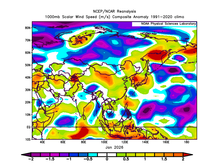 Winds were stronger than normal in China, South Korea, and parts of northern Japan, while the Pacific side of Japan and the Okinawa region were relatively lighter.