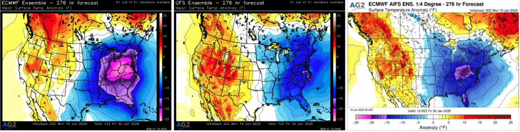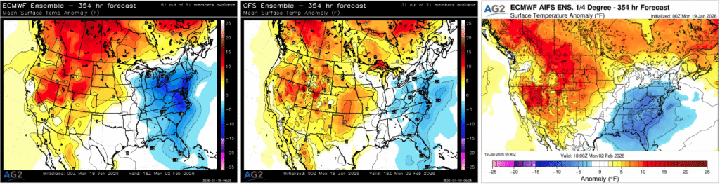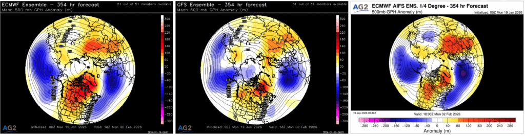 On day 15, the GFS ensemble mean, ECMWF ensemble mean, and ECMWF AIFS ensemble are all telling a very similar large-scale story at the 500 mb level, centered on a high-latitude blocking regime that favors a colder-than-normal North American background state. Each guidance set depicts a ridge building into Alaska, consistent with a negative EPO, which forces the jet stream to buckle downstream and supports colder air delivery into western and central portions of North America. At the same time, ridging extending across the high Arctic reflects a negative AO signal, reinforcing suppression of the polar vortex and allowing cold air to more readily dislodge southward.