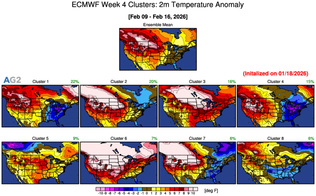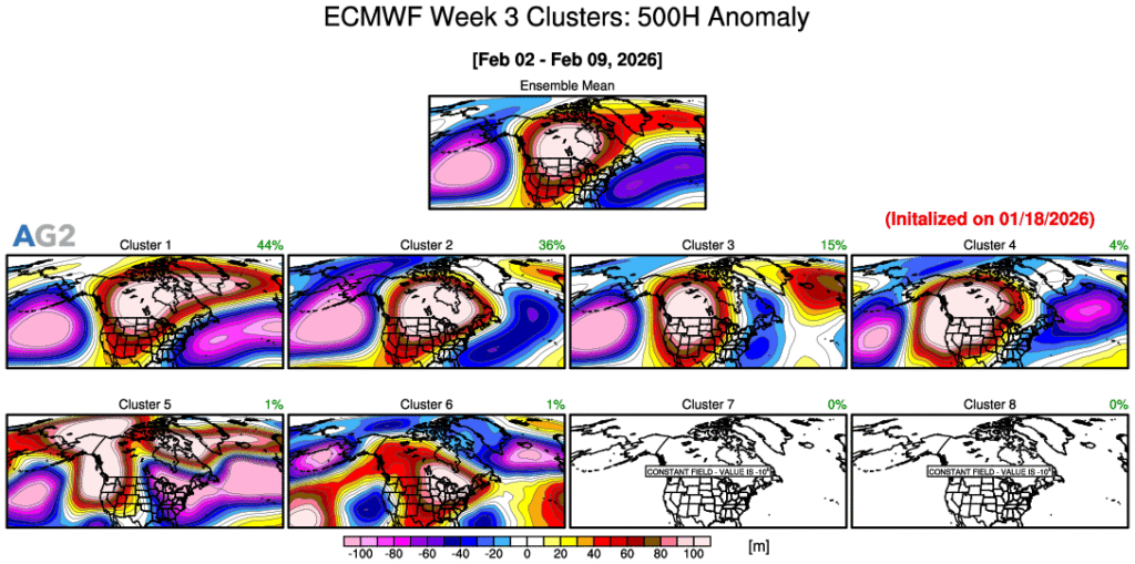 Surface Temperature Anomaly Evolution: At the surface, the temperature anomaly clusters evolve in a way that coherently reflects the upper-air pattern. During Week 2, warmth dominates much of the central and eastern U.S., consistent with still-limited high-latitude blocking and a relatively progressive flow. As the Alaskan ridge strengthens into Week 3, colder anomalies begin expanding southward from Canada, especially across the northern Plains, Midwest, and eventually the East, while warmth becomes increasingly confined to the southern tier and parts of the West. By Week 4, several clusters depict widespread below-normal temperatures across large portions of the U.S., signaling a higher probability of a colder-than-average regime becoming established. While not every solution is uniformly cold, the trend toward broader negative temperature anomalies aligns well with the growing influence of high-latitude blocking and reinforces the idea that mid- to late-January carries an increased risk for impactful cold across the CONUS.