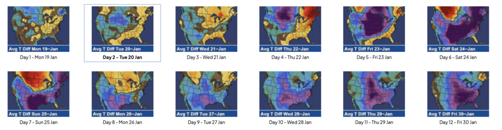 Based on the forecast image, the signal for a cold January in the U.S. is strongly tied to persistent Alaska ridging and a negative EPO look in the mid- to long-range. The 500 mb height anomaly panels show pronounced positive height anomalies centered over Alaska with corresponding negative height anomalies downstream across central and eastern North America, a classic configuration for sustained Arctic air delivery. This pattern forces the jet stream to dive south out of western Canada, allowing cold air to drain repeatedly into the Plains, Midwest, and East. The temperature anomaly and 12-hour change panels reinforce this setup, showing expanding below-normal temperatures spreading south and east with limited Pacific moderation. As the Alaska ridge remains anchored through Days 10–15, the cold source region stays replenished, increasing the likelihood of prolonged cold rather than brief shots. In January, this type of EPO-driven Alaska blocking pattern is especially effective at producing widespread, intense cold across much of the United States. Confidence is rising as models are coming into better agreement on mid-Jan cold outbreak.
