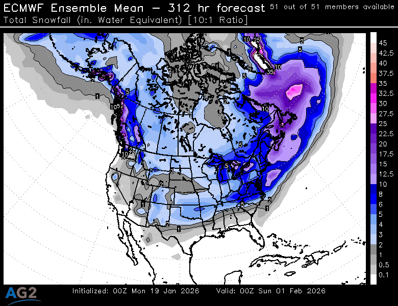 Downstream, all three ensemble systems also indicate a ridge near or over Greenland, aligning with a negative NAO. This Greenland blocking helps slow the overall pattern and encourages troughing across eastern North America. The agreement on this triad of teleconnections (–EPO, –AO, –NAO) is notable at this lead time and lends confidence to the idea that the hemispheric pattern is supportive of sustained cold risks rather than transient shots.