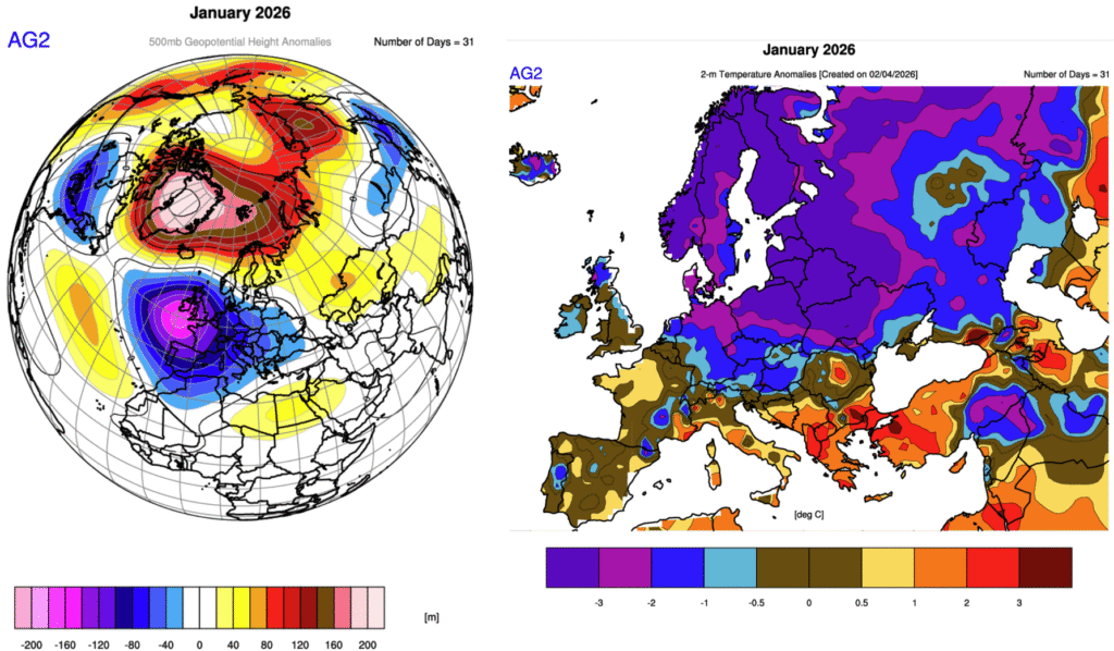 The 500mb geopotential height anomalies and corresponding temperature anomalies for the month of January are shown below. Overall, a -NAO due to higher heights across Greenland/Iceland. However, troughing dominated Europe, centred across the north-west, while higher heights were observed across north-eastern Europe. A very colder month across north-eastern Europe with temperatures well below the climatological normal here. Temperatures were nearer normal across western Europe, while above normal temperatures were observed across the south-east.