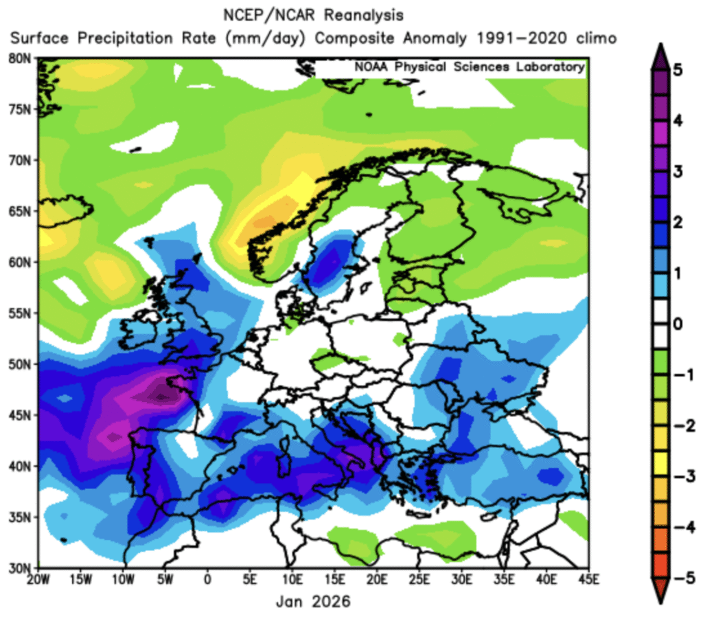 With regards to precipitation, drier conditions were observed to the north-east, with wetter conditions across western and southern Europe.