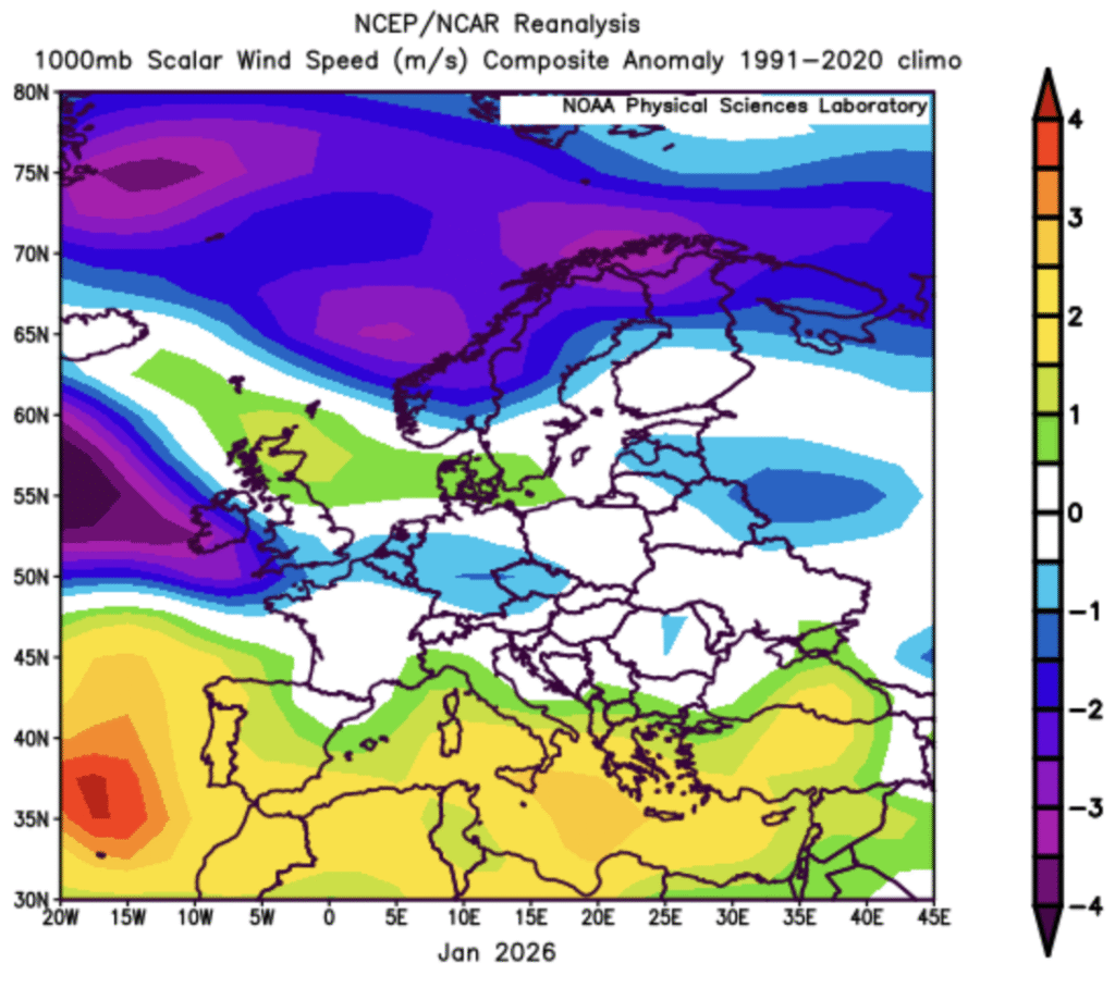 - Wind: Windier than normal NW, calmer through Iberia and E Europe.