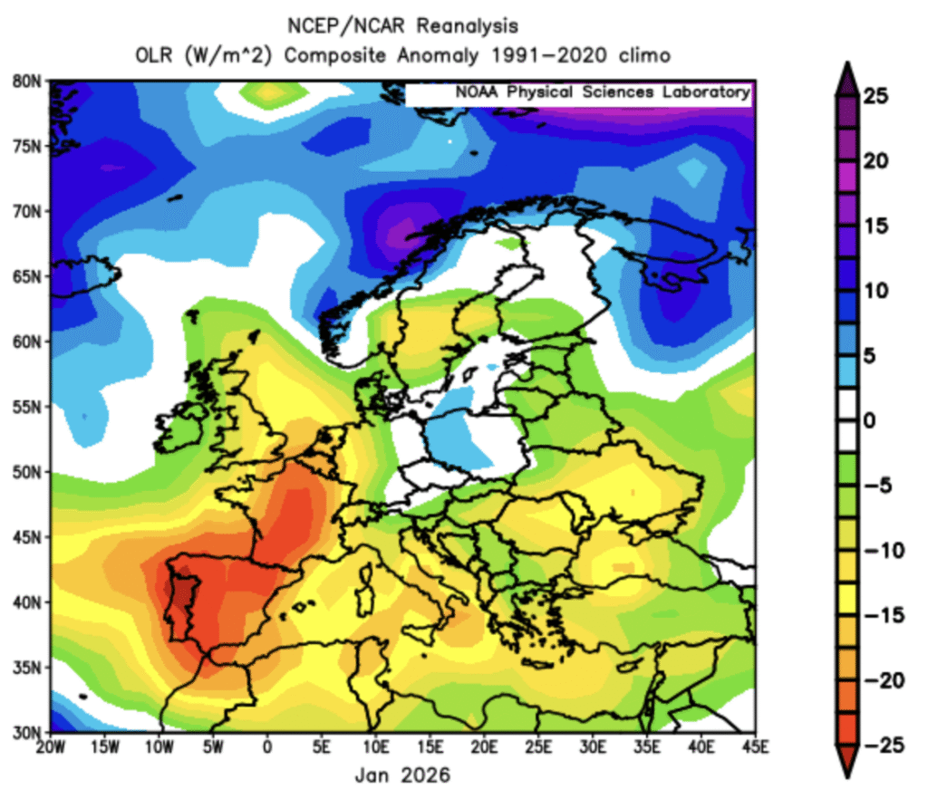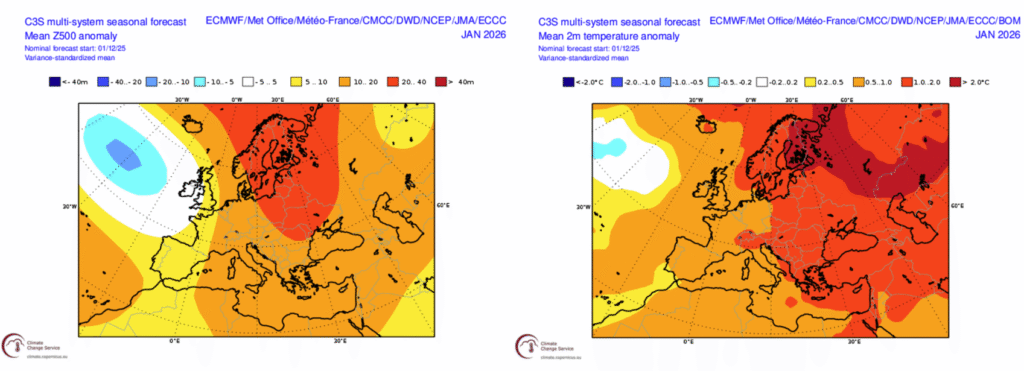 Sub-seasonal guidance keeps on pointing at a milder recovery later in January, linked to enhance Atlantic influence. This should favor wetter and windier conditions into NW Europe under troughing, but there is higher uncertainty on the extent of such into C Europe. Larger scale drivers provide weaker signals limiting somewhat forecast confidence late Jan into Feb right now.