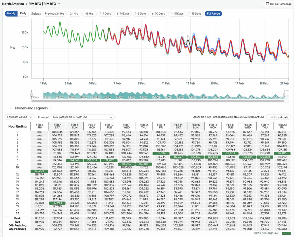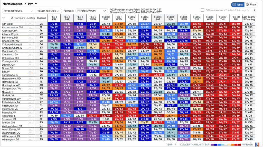 AG2’s PJM load forecast reflects this transition, with higher demand levels early in the colder portion of the outlook followed by a gradual softening as temperatures trend warmer. Daily peaks remain present throughout, but the magnitude of those peaks is expected to ease as heating load fades. This shift from cold-driven demand strength toward more moderate conditions suggests PJM will move from a higher-risk peak demand environment into a more balanced supply-demand outlook later in the forecast window.