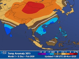 Comparing AG2’s late-November outlook for Dec 2025–Feb 2026 with NOAA reanalysis, results were generally strong for Japan and South Korea. In northern China, the forecast was warmer than observed, while in southern China it was cooler than observed.