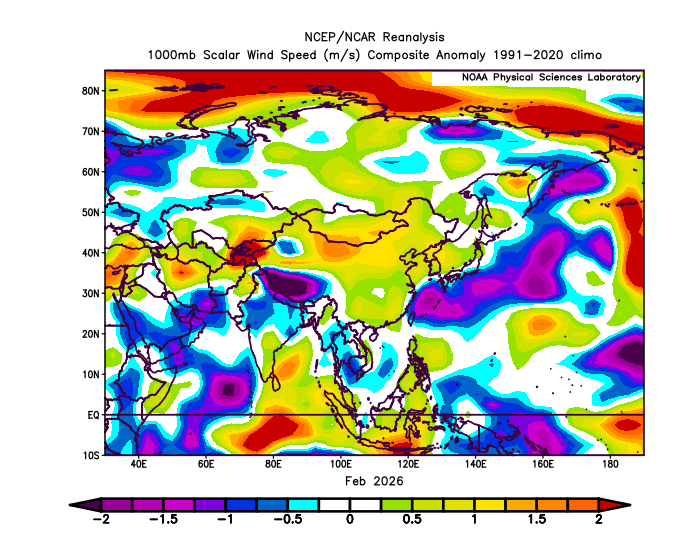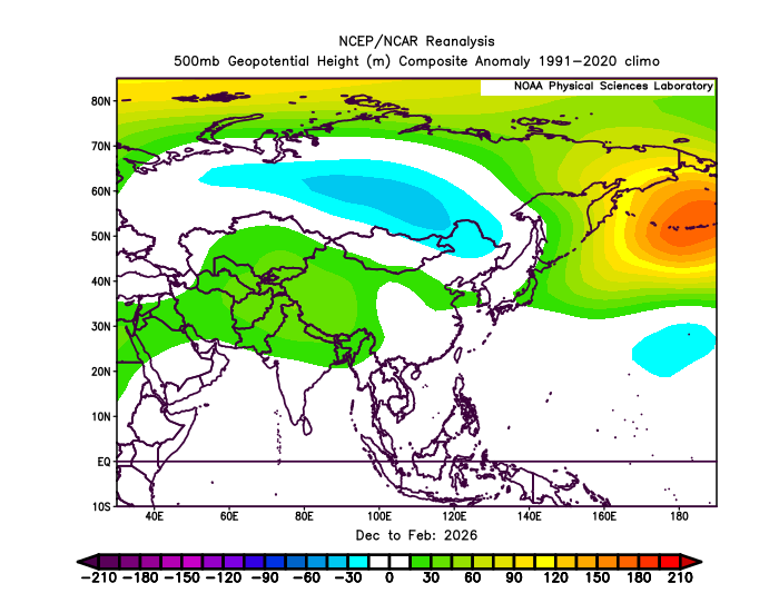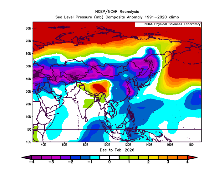SLP was lower than normal across much of East Asia, while higher-than-normal pressure was present near the Aleutians. This setup made persistent “classic winter monsoon” patterns less likely. Cold-air outbreaks occurred mainly in January and early February, but they were generally short-lived.