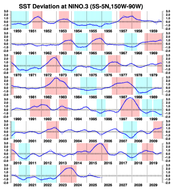 Looking back, the most recent strong El Niño peaked in late 2023 into early 2024, with Niño 3.4 sea surface temperature anomalies well above +2°C. By summer 2024, that event was already weakening toward neutral, and by late 2024 into 2025 the signal shifted slightly negative, reflecting weak La Niña conditions. As a result, summers 2024 and 2025 were not dominated by strong ENSO forcing; both occurred under weak La Niña or near-neutral backgrounds, meaning the tropical Pacific did not provide a pronounced large-scale driver.