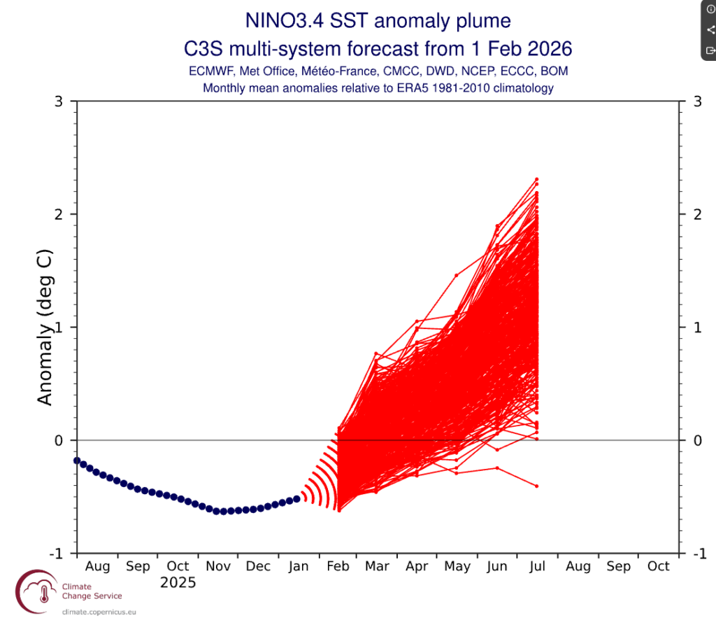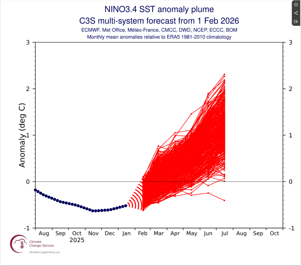 The current C3S multi-system plume issued in February 2026, however, shows a clear upward trajectory in Niño 3.4 anomalies through boreal spring into summer, with many ensemble members reaching or exceeding +1.5°C and some approaching or surpassing +2°C by early to mid-summer. That places 2026 on track for a potentially strong El Niño.