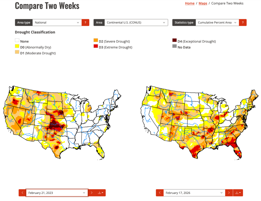 However, there is an important difference: drought conditions today are more widespread and more entrenched across parts of Texas and the southern Plains than they were in February 2023. Comparing the February 2023 drought monitor to the current map shows broader coverage of moderate to extreme drought categories. That matters because dry soils amplify heat. When the land surface lacks moisture, less energy goes into evaporation and more goes directly into warming the air. This land–atmosphere feedback can intensify heat waves and reduce afternoon cloud development, reinforcing a hotter and drier regime.