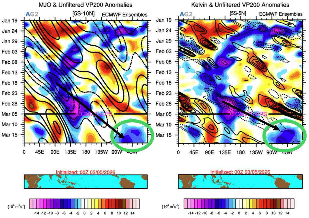 Tropical convection is forecast to emerge in the Atlantic basin into mid-March, and it has been monitored for a while for its potential to be a cold trigger for Europe. The latest projections suggest that such convections could be supported by active phases of both the MJO and a Kelvin Wave. If those two oscillation synchronize could provide a larger magnitude forcing as a consequence on to the NAO index.