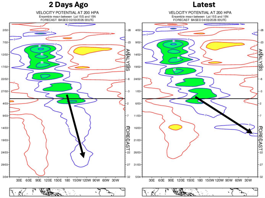 Compared to a couple of days back, the latest filtered velocity potential forecasts from ECMWF, show a quicker E’ward progression of tropical convection (some combination of MJO and Kelvin Wave) towards the Americas and the Atlantic. Quicker arrival of more organized convection into the Atlantic equals earlier and perhaps higher risks of seeing a colder or at least less mild shift in Europe.