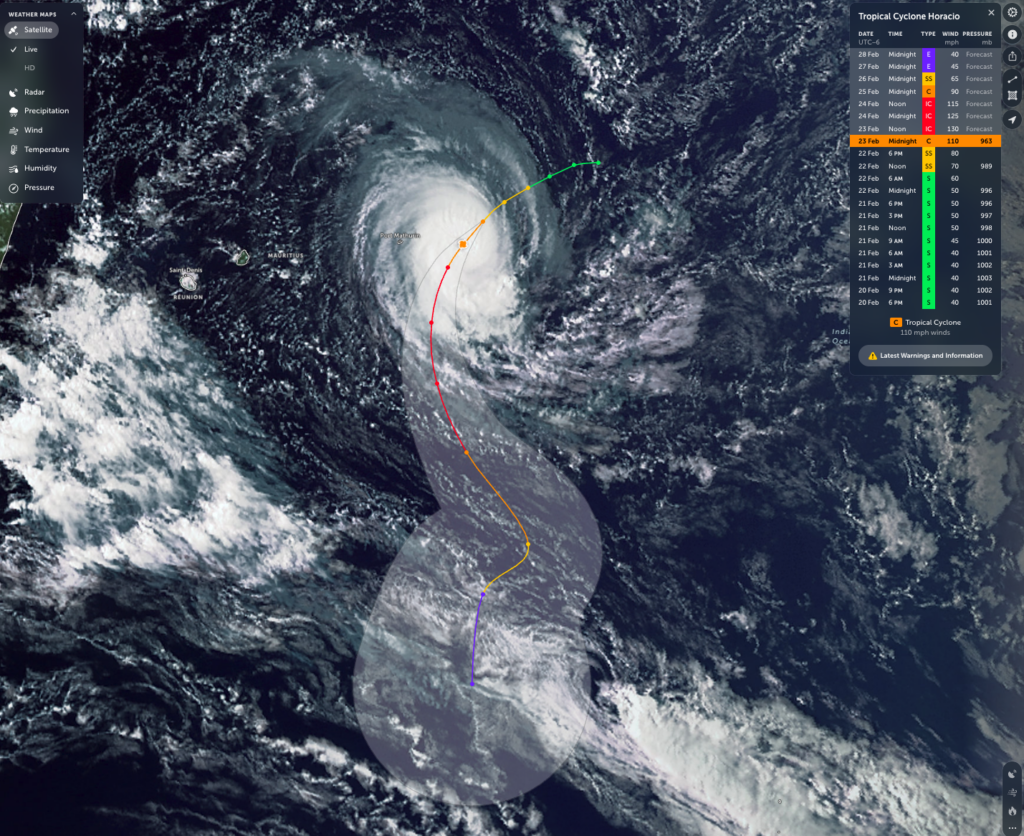 Tropical Cyclone Horacio is currently churning across the southwest Indian Ocean, east of Madagascar and near Mauritius and Réunion, displaying a well-defined spiral structure with a dense, powerful core. Satellite imagery shows tightly wound rainbands wrapping around a bright central mass of thunderstorms, a sign of an organized and strengthening system. Forecast data indicates Horacio has reached cyclone intensity, with winds around 110 mph and pressure near 963 mb at peak strength, and it is expected to gradually curve southward over open waters in the coming days. While the storm’s projected path keeps the most destructive winds offshore, outer rainbands could still bring rough seas, gusty winds, and heavy rainfall to nearby islands.