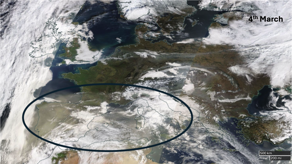 The satellite image from yesterday below, clearly shows the hazier skies across Iberia, the Mediterranean to Italy associated with the current Saharan dust outbreak: