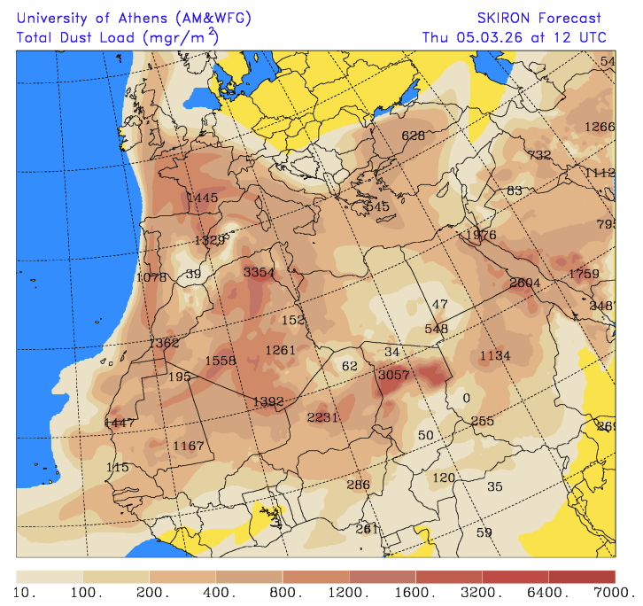 The latest dust load forecast from the University of Athens below shows the highest dust load currently across parts of Iberia, France to southern areas of the British Isles today, before then spreading to Benelux and Germany tomorrow. Through front weekend, dust levels are forecast to remain elevated across northern Europe.