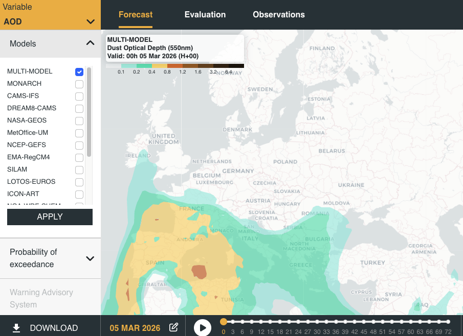 The Barcelona Dust Regional Centre forecast to aerosol optical depth (AOD) below shows a similar pattern of higher levels spreading across northern Europe over the next few days.