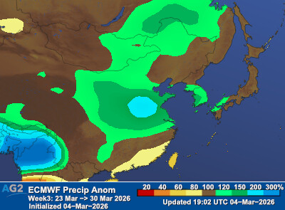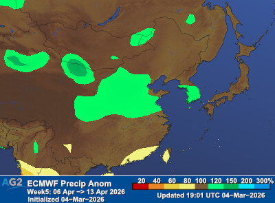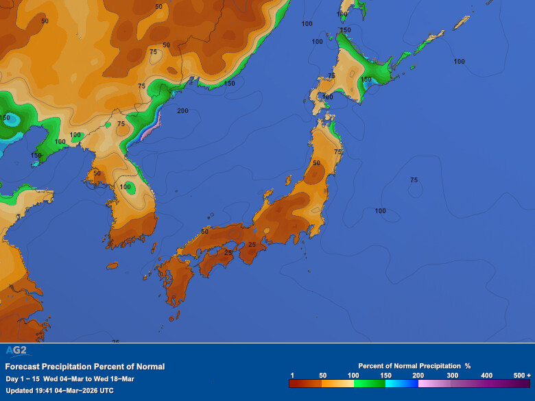 Precipitation was above normal in northern Japan, western Japan, Northeast China, and parts of eastern China, while eastern Japan, South Korea, and southern China were drier than normal.